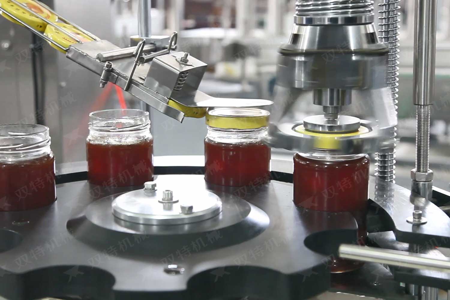 旋蓋機主要用于玻璃廣口瓶的三、四、六鐵蓋真空旋蓋,用兩根不同速度的皮帶壓瓶蓋,因兩根皮帶的速度不同,對蓋進行搓蓋收緊達到旋蓋目的。在自動上蓋之前對瓶口吹蒸汽加熱,吹掉冷空氣,換上高溫蒸汽,立即旋蓋,根據(jù)熱脹冷縮原理,蒸汽冷下來就自然形成了瓶內(nèi)真空,達到了真空旋蓋的目的。自動旋蓋機可以和濃醬灌裝機、蜂蜜灌裝機、辣椒醬灌裝機組合在一起,形成一套全自動灌裝設(shè)備,是現(xiàn)代調(diào)味品企業(yè)的得力幫手。